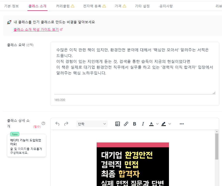 클래스 상세 소개 부분에는 전자책 표지와 더 상세한 소개 문구를 넣었다.
