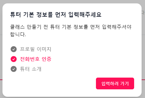 그럼 튜터 기본정보를 먼저 입력해달라고 뜨는데, 프로필 이미지와 전화번호 인증, 튜터 소개를 입력하면 된다.