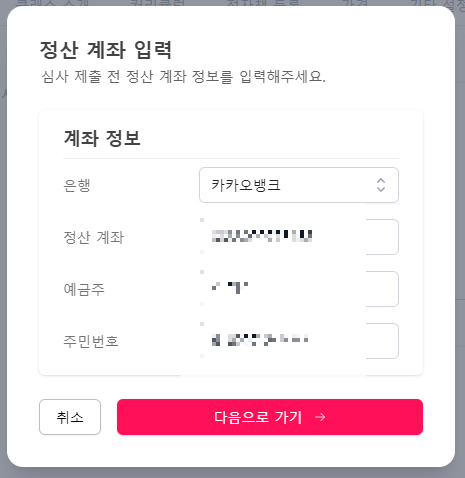 우선 9,800원으로 기재했다. 그 다음은 정산 계좌를 입력한다.